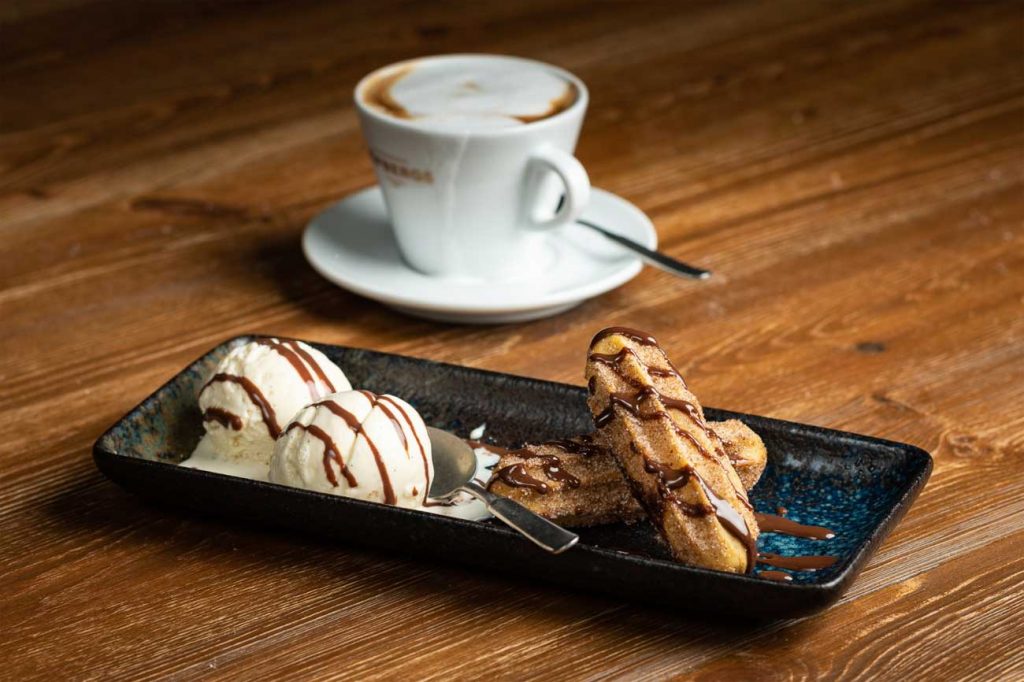friteeratut espajalaiset munkit, suklaakastiketta ja vaniljajäätelöä