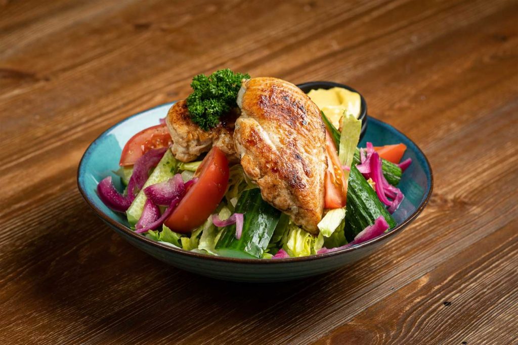 salaattipedillä lämmintä broilerinfileetä, tomaattia, kurkkua, punasipulihilloketta sekä yrttiöljyä ja currydippiä.