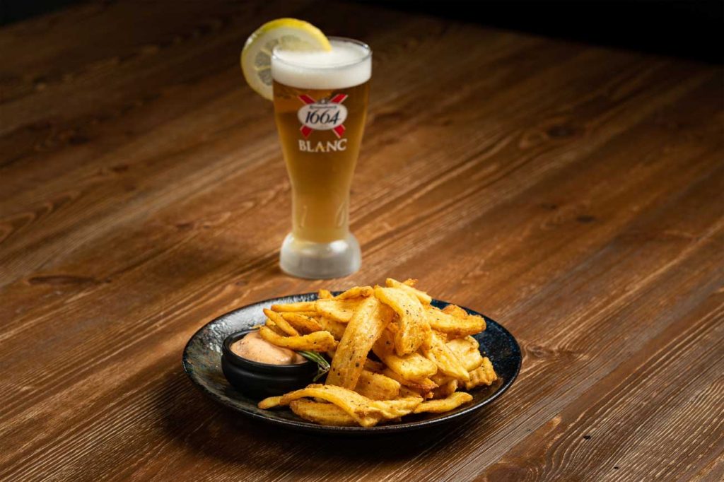 Annokset tarjoillaan ranskalaisten ja pippuriketsupin tai vihersalaatin ja yrttiöljyn kera.